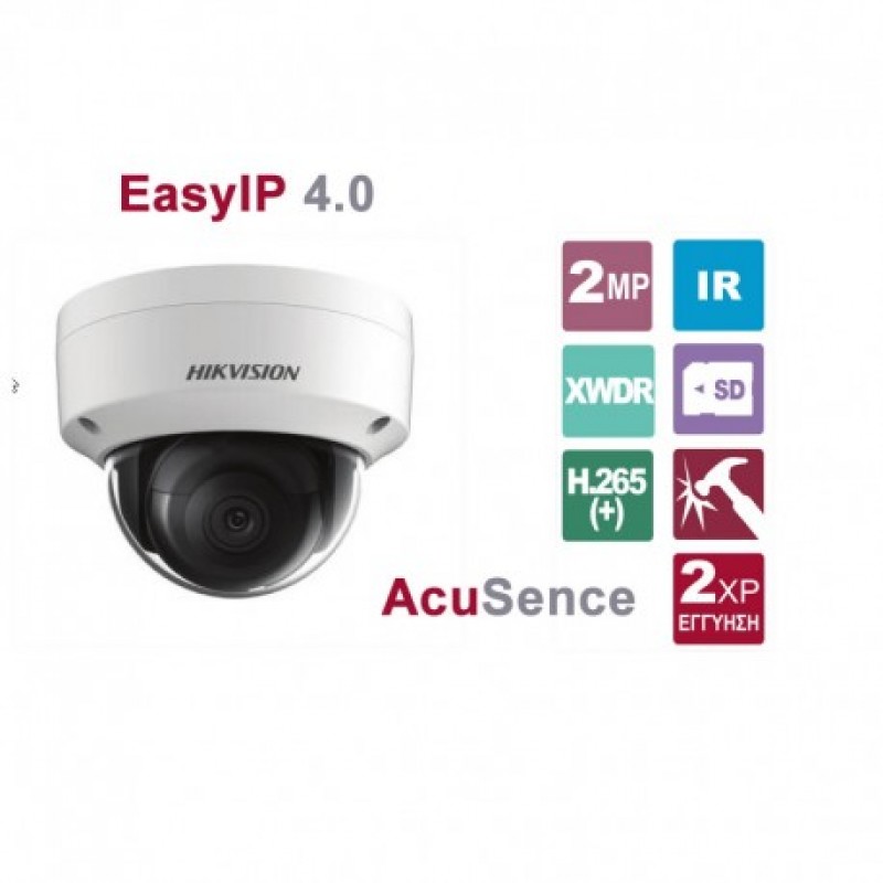Δικτυακή κάμερα Dome 2MP AcuSense, τεχνολογία DarkFighter, 1/2.8", σταθερός ευρυγώνιος φακός 2.8mm (γωνία θέασης 108°), H.265+, 120dB WDR, υπέρυθρος φωτισμός (ΕΧIR 2.0) εμβέλειας ως 30 m, 3D DNR, BLC, ROI, false alarm filter by target classification, υποδοχή κάρτας Micro SD/SDHC/SDXC ως 128 GB για τοπική καταγραφή video, βαθμός στεγανότητας IP67, αντιβανδαλιστική προστασία ΙΚ10, τροφοδοσία PoE ή 12 VDC, κατανάλωση 7 W / 8.5 W (PoE), (διάμετρος x ύψος) 121×92 mm.