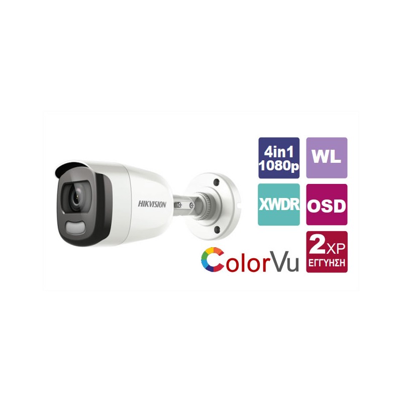 Κάμερα Bullet 4in1 1080p, ColorVu, εξωτερικού χώρου, με σταθερό φακό 3.6 mm (γωνία θέασης 83.6°), εξαιρετικά υψηλή ευαισθησία για έγχρωμη εικόνα ημέρα - νύκτα, αυτόματος λευκός θερμός φωτισμός Smart Light εμβέλειας ως 20 m, WDR 120dB, 3D DNR, OSD menu Up The Coax (UTC), IP67, κατανάλωση 3 W, (ΠxBxY) 68x181x70 mm.