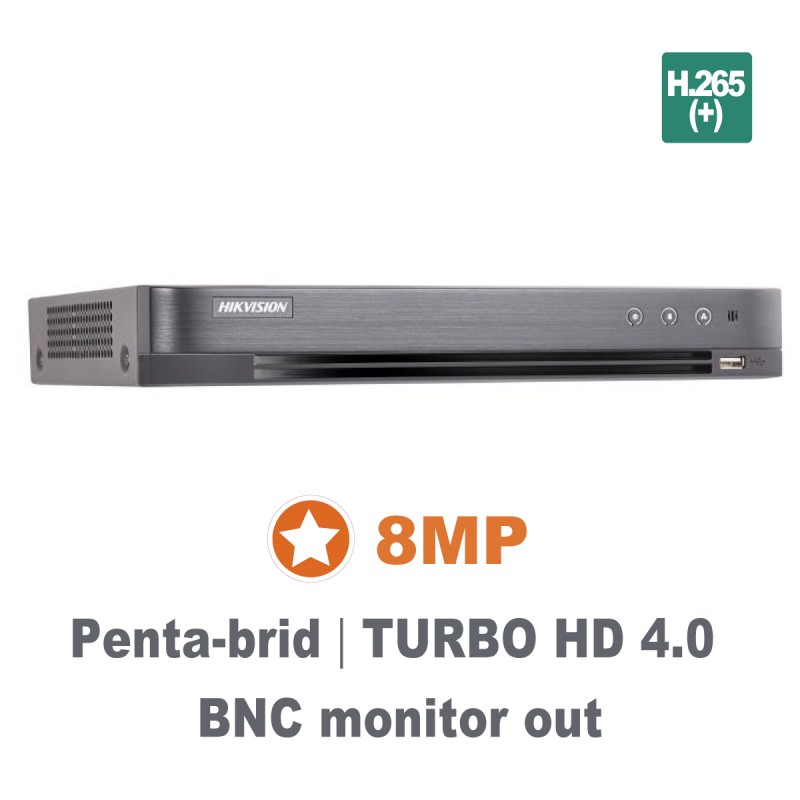 8 είσοδοι HDTVI οποιασδήποτε σειράς, με ανάλυση 8MP ως 720p συμβατικών καμερών + 4 IP καμερών έως 6MP, 8fps @ 8MP, 12fps @ 5MP /15fps @ 4MP / 18fps @ 3MP / 25fps (real time) @ 1080p / κ.λ.π., 25fps (real time) για κάθε IP κάμερα, έξοδοι video monitor HDMI/VGA/BNC, 1 σκληρός δίσκος έω1 8ΤΒ. Υποστήριξη 4 καναλιών με την λειτουργία AcuSense.